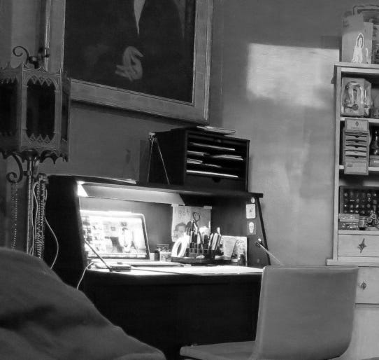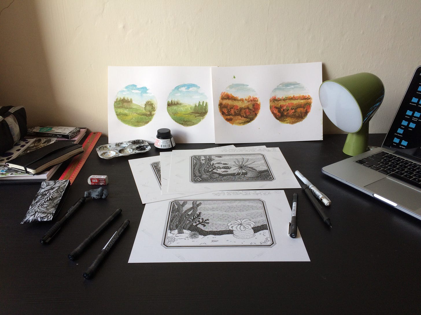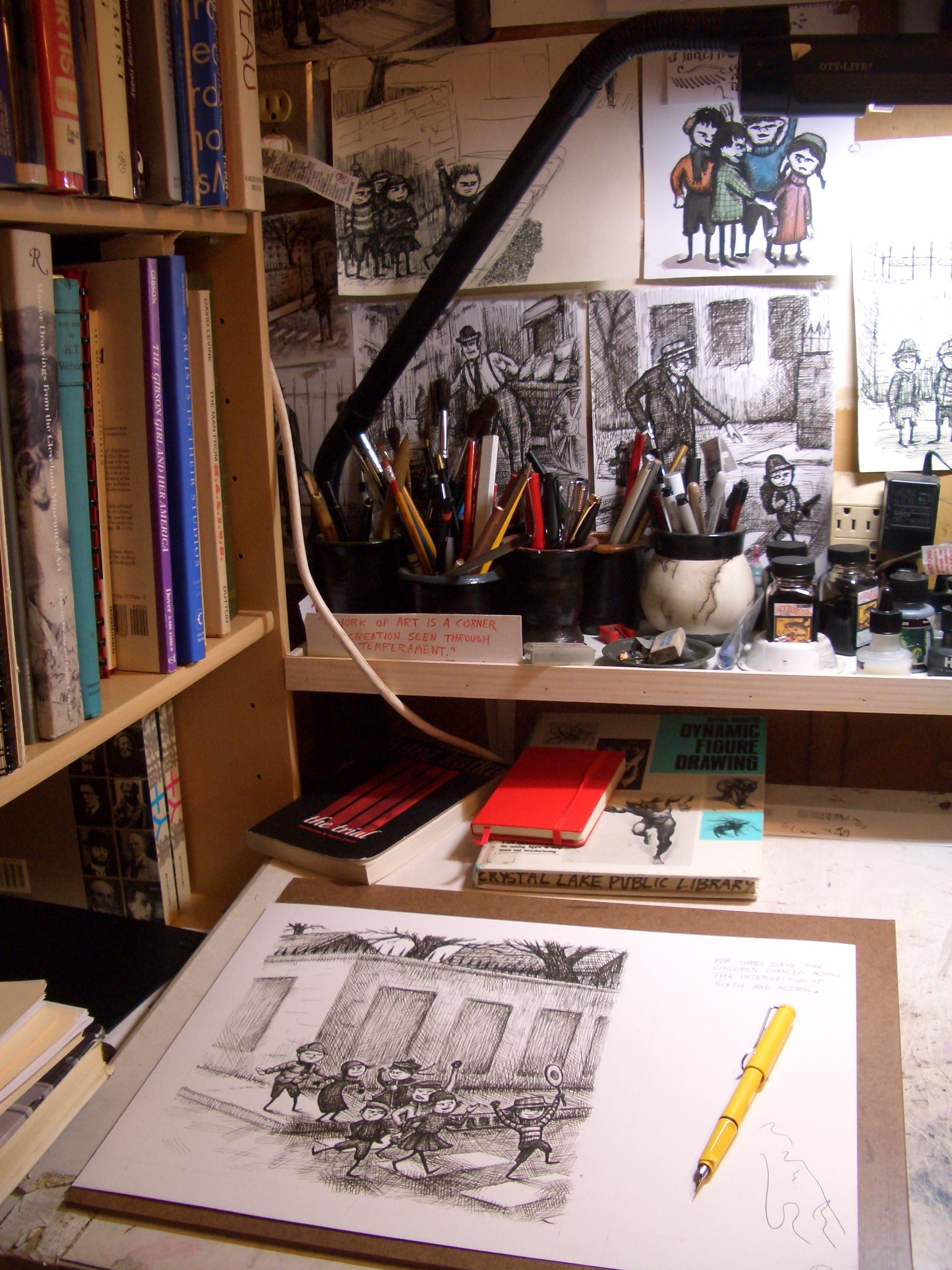 One of the joys of switching my focus to illustration was the realization that I required far less equipment and space. While certainly uncomfortable for someone who likes a routine, the ability to take my work with me when I traveled was a freedom I had not before experienced and which emphasized the point to me that the studio will squeeze in almost anywhere–provided there is an ample light source.