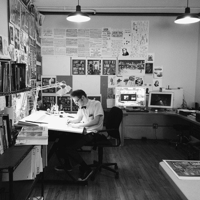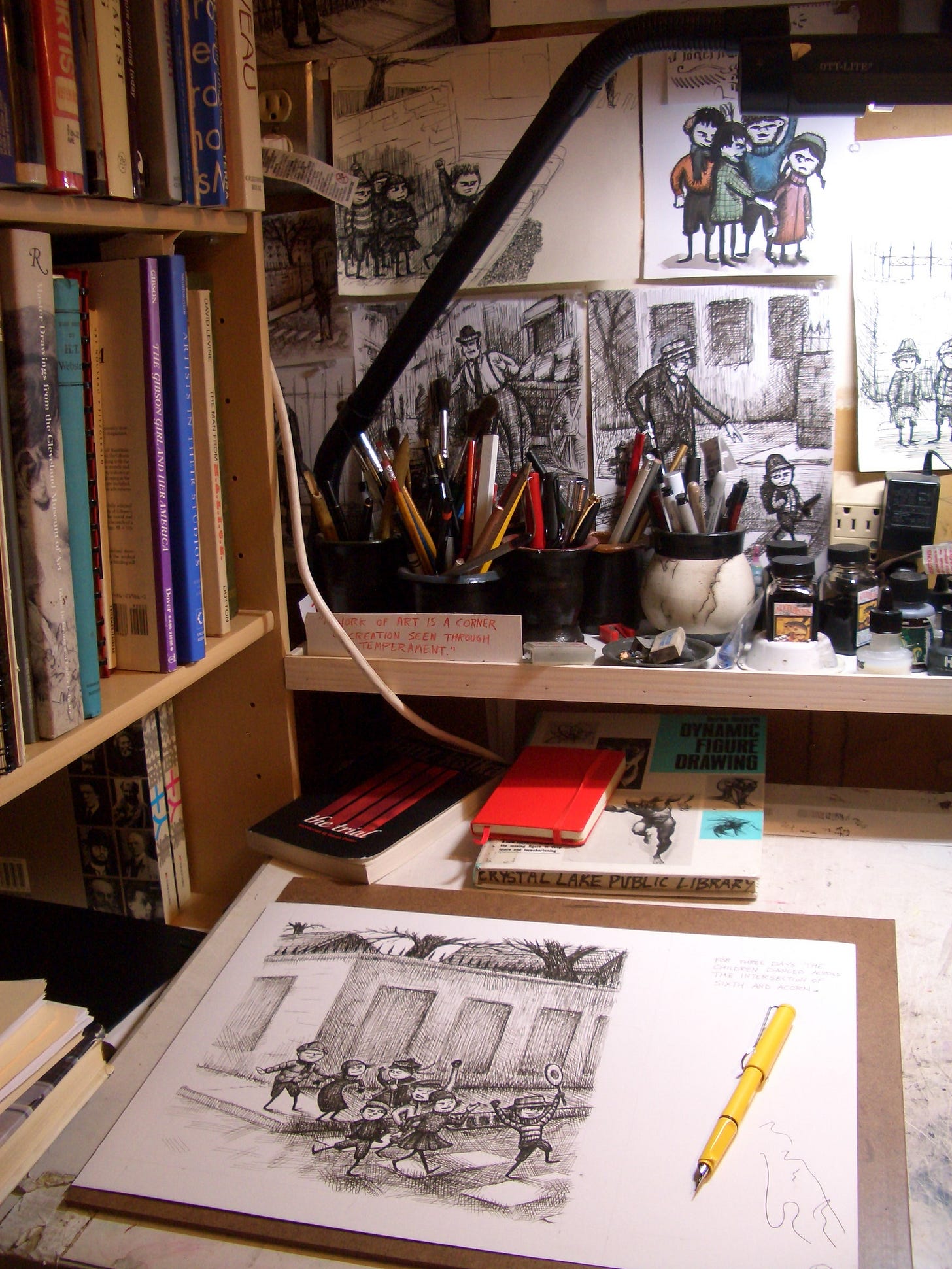 I’ve never had such a generous working environment as this studio and probably never will again. In spite of this, during the last year of working on the drawings for the book, I began frequently traveling back and forth between Chicago and Los Angeles. While stressful at first, I became adept at carrying my entire studio with me, and I would set up with my drawing board in airports, coffee shops, and various friend’s houses. I even began carrying around a clip-on gooseneck battery powered LED light to ensure that I could work in any lighting condition.