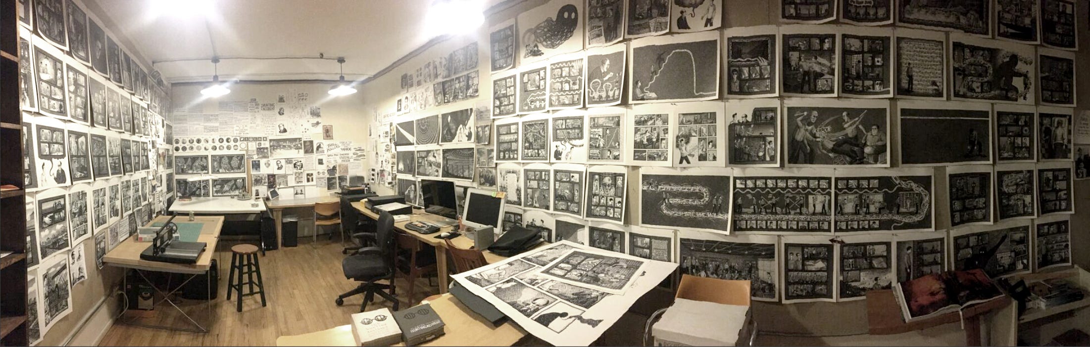 When I eventually decided to move to Los Angeles, I still had approximately fifty more pages of the book to ink and the place I was staying did not have much space in which to set up a proper studio. I thus created one entirely contained within a fold-up desk set up in the corner of the bedroom.