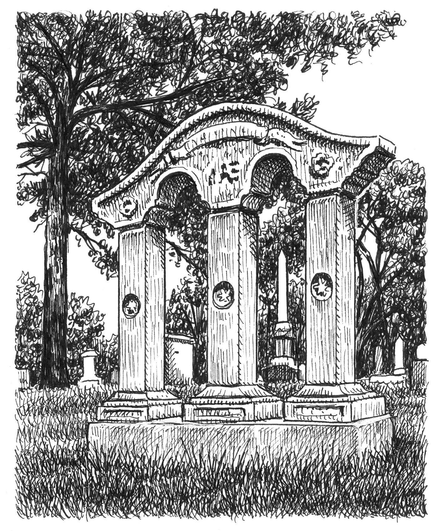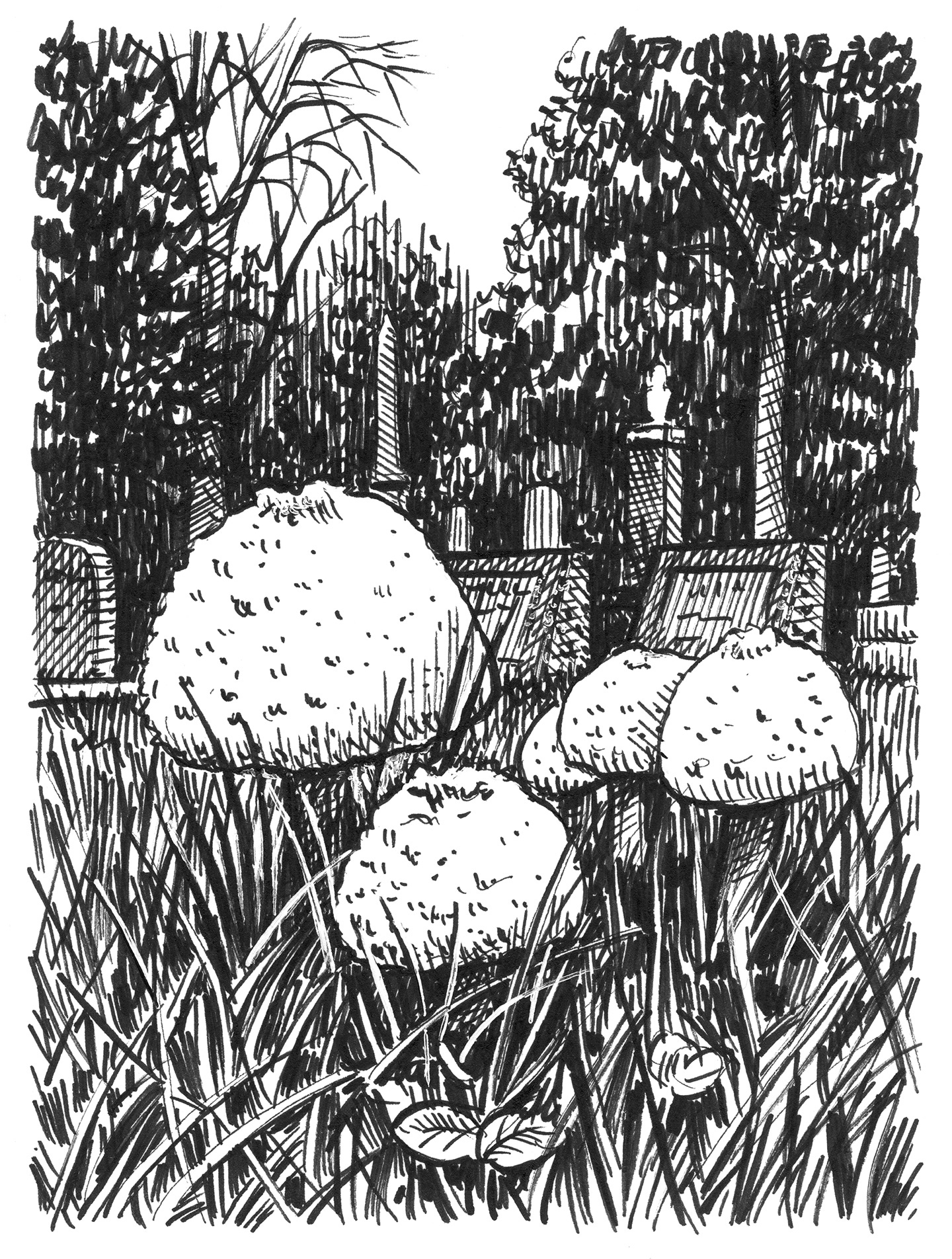I took a day-long walk a couple weeks ago in order to clear my head and I stopped at a cemetery in Wheaton, Illinois for a break. I was there once before during the pandemic but I hadn’t explored the entirety of it. I stumbled upon this double arched gravestone and couldn’t remember ever having seen one quite like it before. Even single arched gravestones are somewhat of a rarity so I thought this one deserved a drawing. The second drawing with the large mushrooms is from a recent excursion to Forest Home Cemetery, one of my most frequented cemeteries located in Forest Park, Illinois.